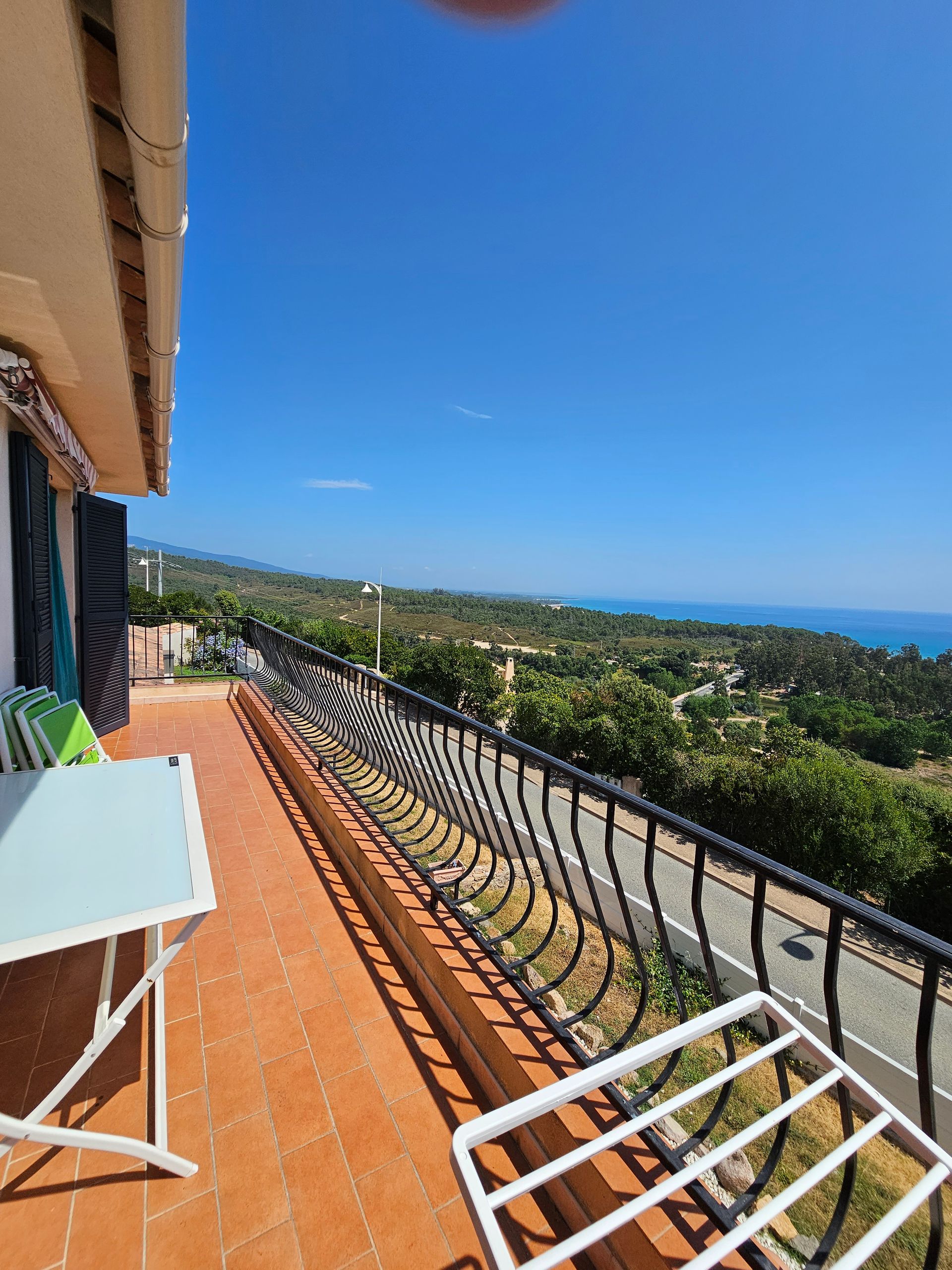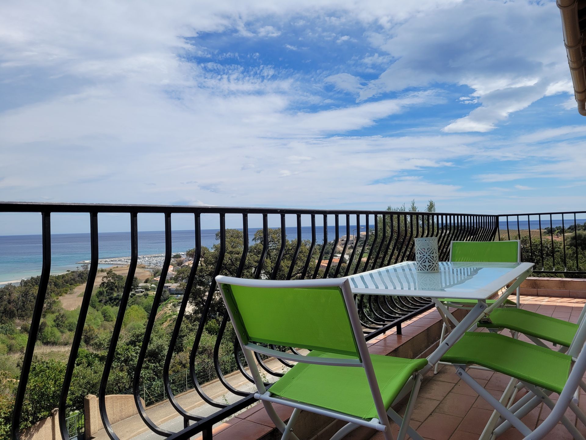 - Une terrasse solarium vue mer et port de Solenzara avec une table 4 chaises, 2 relax, store